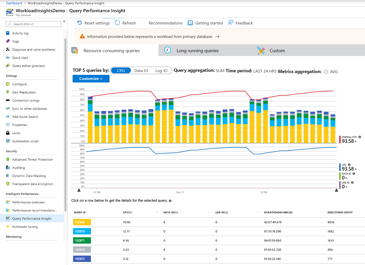 - The top chart shows a line with the overall database DTU percentage. The bars are the CPU percentage that the selected query consumed.