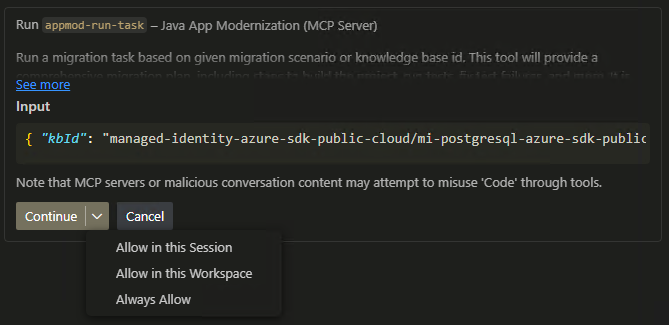 Sometimes, GitHub Copilot modernization requires explicit confirmation before proceeding. You can type yes or continue in the chat to enable the agent to move forward with the code modifications.