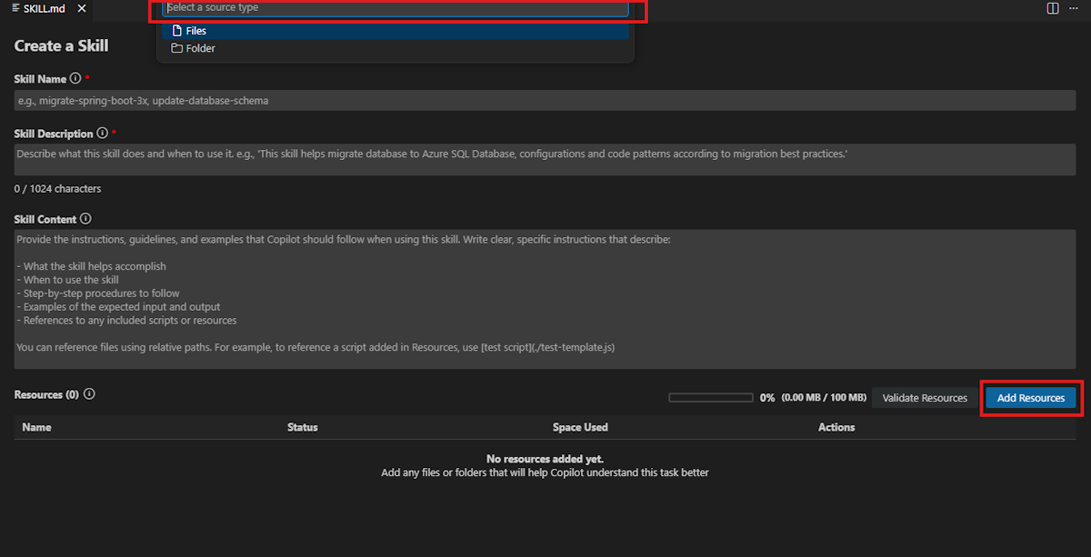 Resources provide reference knowledge that Copilot uses when it applies the skill. Select Add Resources and choose a resource type: