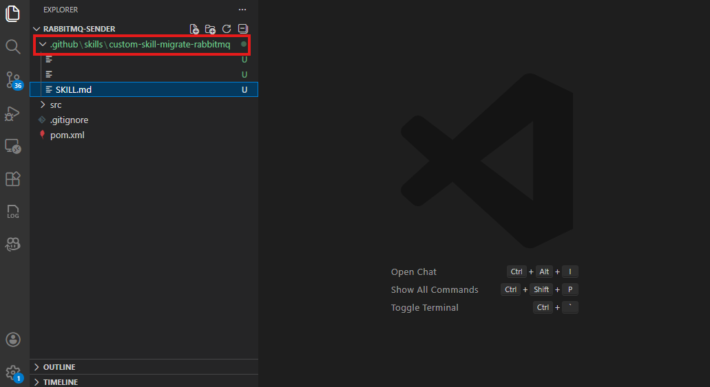 SKILL.mdfile opens. Fill in the following fields. For the full skill format specification, see the Agent Skills specification.- Skill Name: A descriptive, hyphenated identifier for the skill. For example, "Custom-skill-migrate-rabbitmq".