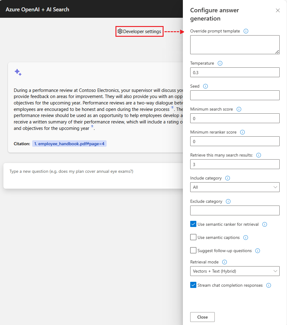 The specific OpenAI model determines the intelligence of the chat and the settings used to interact with the model. The Developer settings option opens the Configure answer generation pane where you can change settings for the chat app:
