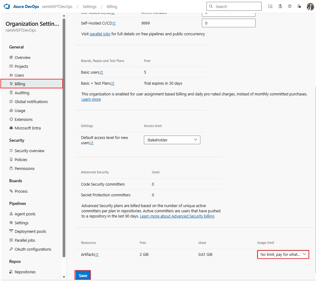 Azure Artifacts provides 2 GiB of free storage per organization. This free tier is intended to help you evaluate Azure Artifacts. As your organization scales or begins handling production workloads, we recommend that you set up billing for your organization to ensure you have sufficient storage capacity.