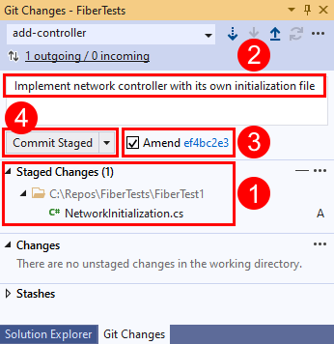 In the Git Changes window, optionally stage one or more files, enter a commit message, select Amend, and then choose Commit Staged.