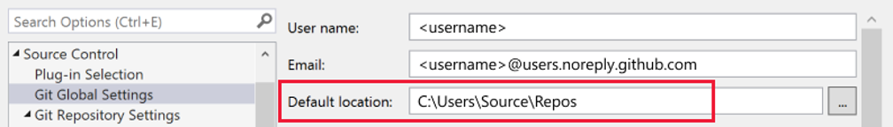 Visual Studio Git-related settings, which are Visual Studio settings that relate to Git but aren't stored in any Git configuration file. You can only view and modify these settings in Visual Studio. An example of one of these settings is the default folder path where Visual Studio clones repos.