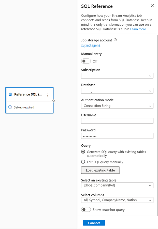 To configure SQL Database as reference data input, select Reference SQL Database under the Inputs section on the ribbon. Then fill in the information to connect your reference database and select the table with your needed columns. You can also fetch the reference data from your table by editing the SQL query manually.