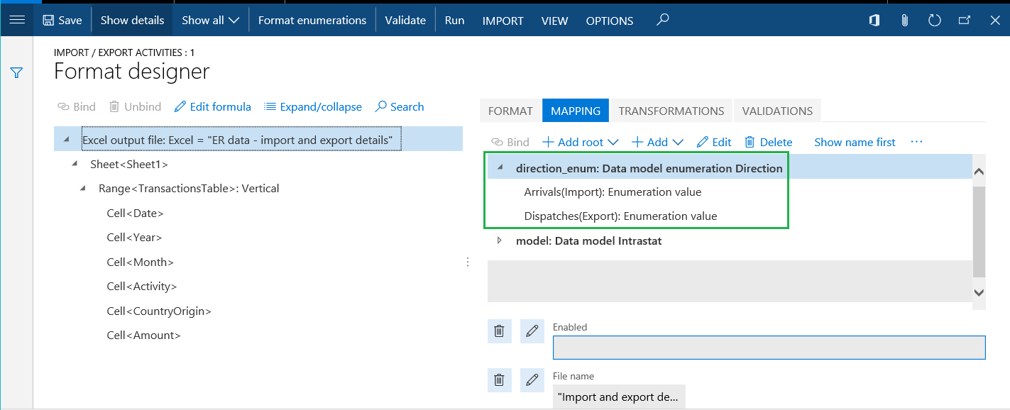 Når den er kørt, genererer ER-formatet outputresultatet i Excel-format. Den sender oplysninger om Intrastat-transaktionerne til outputresultatet og adskiller dem som transaktioner, der beskriver enten importaktiviteter eller eksportaktiviteter. Klik på Kør for at teste det nye format ER på en liste over Intrastat-transaktioner på siden Intrastat (Moms>Erklæringer>Udenrigshandel>Intrastat).