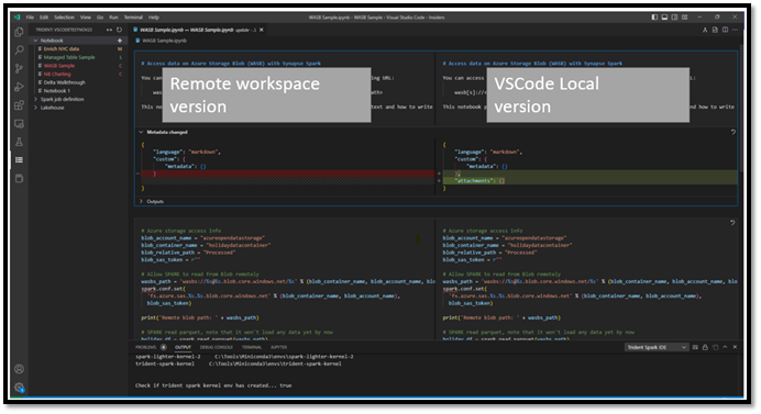 Udvidelsen Fabric Data Engineering VS Code understøtter fuldt ud oprettelse, læsning, opdatering og slet (CRUD) notebook-operationer i Fabric. Udvidelsen understøtter også synkronisering mellem lokale arbejdsområder og fjernarbejdsområder. Når du synkroniserer ændringer, kan du løse eventuelle konflikter eller forskelle mellem dit lokale arbejdsområde og fjernarbejdsområdet.