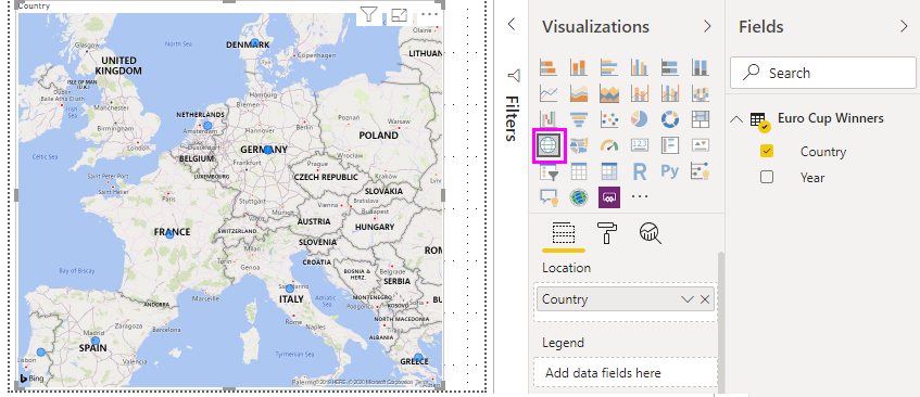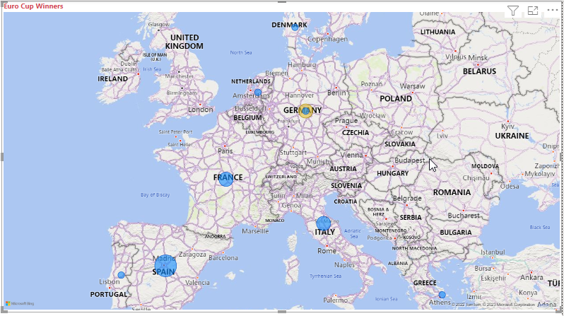 Du kan ændre udseendet af en visualisering ved at vælge den og derefter vælge ikonet Format ( malerbørste) i ruden Visualiseringer . Datapunkterne "Tyskland" i din visualisering kan f.eks. være misvisende, fordi Vesttyskland vandt to turneringer, og Tyskland vandt én. Kortet lægger de to punkter oven på hinanden i stedet for at adskille eller lægge dem sammen. Du kan farvelægge disse to punkter forskelligt for at fremhæve dette faktum. Du kan også give kortet en mere beskrivende og attraktiv titel.