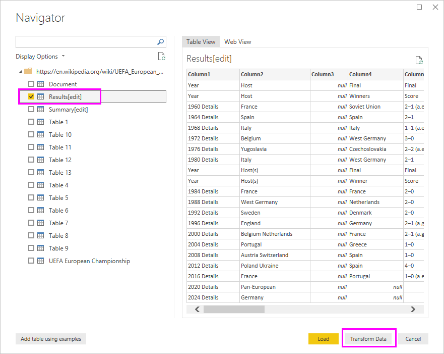 Vælg Tabel 3 på listen Navigator , og vælg derefter Transformér data.