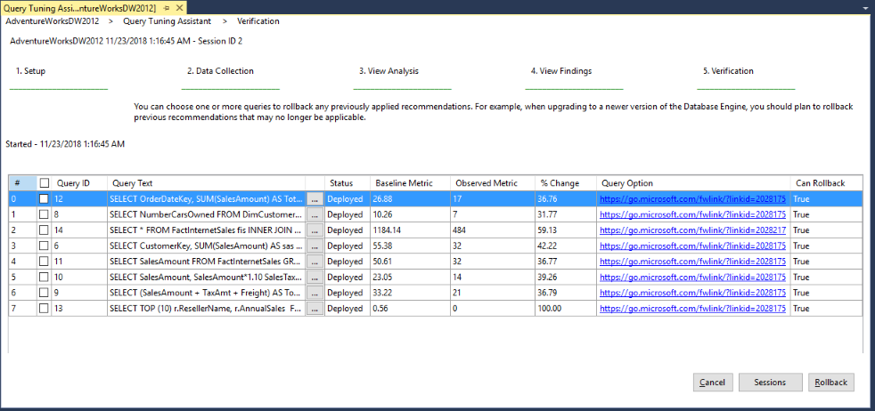 Verification shows the deployment status of previously selected queries for this session. The list in this page differs from the previous page by changing the Can Deploy column to Can Rollback. This column can be True or False depending on whether the deployed query optimization can be rolled back and its plan guide removed.