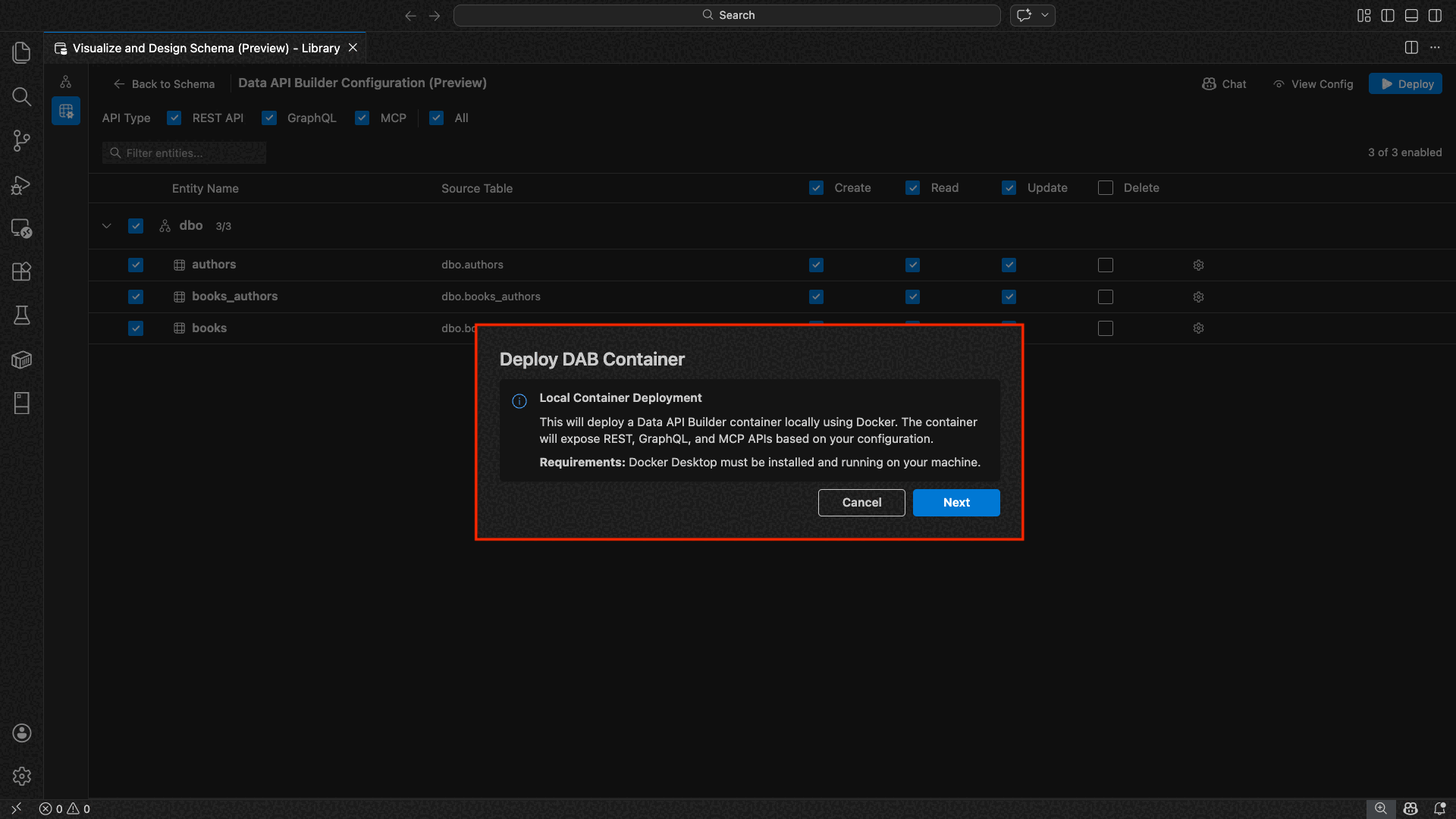 The MSSQL extension for Visual Studio Code includes an integrated UI for Data API builder, so you can create REST, GraphQL, and MCP endpoints for your SQL database tables without writing configuration files or leaving Visual Studio Code. You can select which tables to expose, configure CRUD permissions, choose API types, preview the generated configuration, and deploy a local backend powered by Data API builder, all from a visual interface.