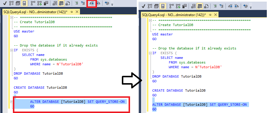 USE master; GO --Drop the database if it already exists IF EXISTS (SELECT name FROM sys.databases WHERE name = N'TutorialDB') DROP DATABASE TutorialDB; GO CREATE DATABASE TutorialDB; GO ALTER DATABASE [TutorialDB] SET QUERY_STORE = ON; GOHighlight the Alter Database portion of the text, and then select the Increase Indent button on the toolbar to move the highlighted text to the right: