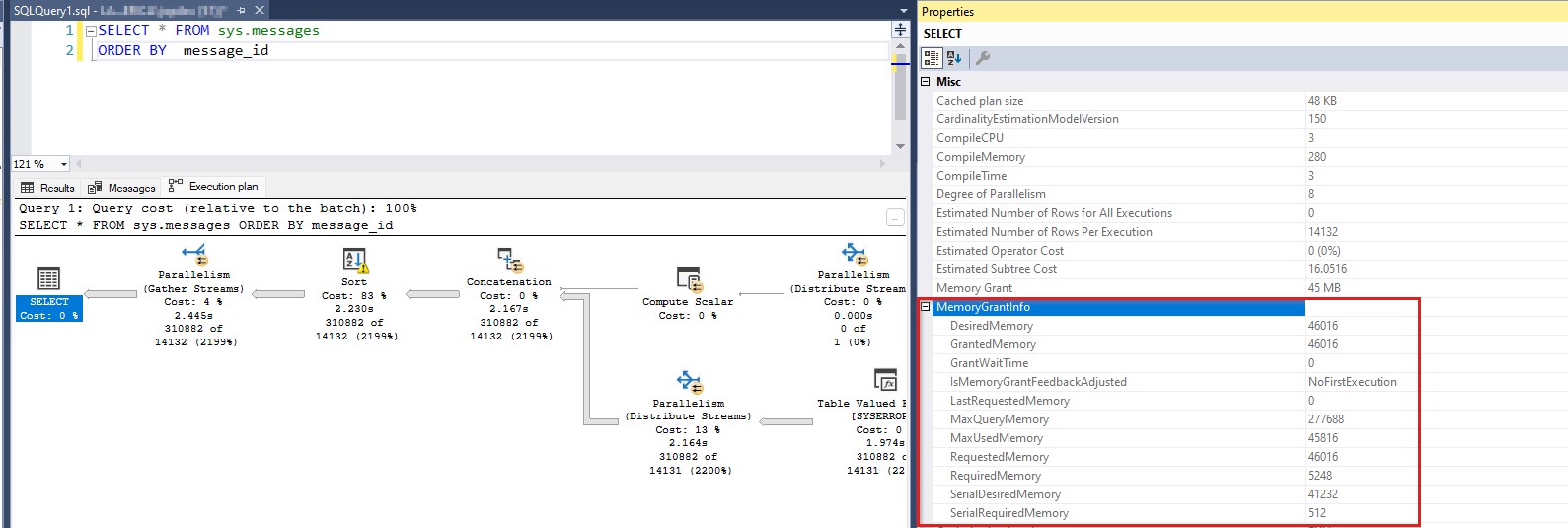 <MemoryGrantInfo SerialRequiredMemory="512" SerialDesiredMemory="41232" RequiredMemory="5248" DesiredMemory="46016" RequestedMemory="46016" GrantWaitTime="0" GrantedMemory="46016" MaxUsedMemory="45816" MaxQueryMemory="277688" LastRequestedMemory="0" IsMemoryGrantFeedbackAdjusted="No: First Execution" />