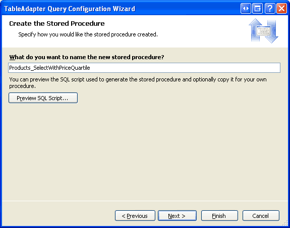 Einer der Vorteile der Verwendung gespeicherter Prozeduren anstelle von Ad-hoc-SQL-Anweisungen besteht darin, dass das erneute Ausführen des TableAdapter-Konfigurations-Assistenten die Spaltenlisten der gespeicherten Prozeduren nicht ändert. Überprüfen Sie dies, indem Sie mit der rechten Maustaste auf das TableAdapter-Objekt klicken, im Kontextmenü die Option "Konfigurieren" auswählen, um den Assistenten zu starten, und klicken Sie dann auf "Fertig stellen", um ihn abzuschließen. Wechseln Sie als Nächstes zur Datenbank, und zeigen Sie die gespeicherte Products_SelectWithPriceQuartile Prozedur an. Beachten Sie, dass die Spaltenliste nicht geändert wurde. Wenn wir Ad-hoc-SQL-Anweisungen verwendet hätten, hätte das erneute Ausführen des TableAdapter-Konfigurationsassistenten diese Abfragespaltenliste so zurückgesetzt, dass sie der Hauptabfragespaltenliste entspricht, wodurch die NTILE-Anweisung aus der von der GetProductsWithPriceQuartile Methode verwendeten Abfrage entfernt würde.