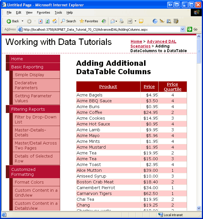 Mit einigen Codezeilen konnten wir die GridView erweitern, sodass sie die Produktzeilen basierend auf ihrem PriceQuartile Wert gefärbt hat. Wir könnten diese Produkte im ersten Quartil ein Hellgrün, diejenigen im zweiten Quartil ein hellgelb und so weiter färben. Ich ermutige Sie, einen Moment Zeit zu nehmen, um diese Funktionalität hinzuzufügen. Wenn Sie eine Aktualisierung für die Formatierung einer GridView benötigen, lesen Sie das Lernprogramm " Benutzerdefinierte Formatierung basierend auf Daten ".