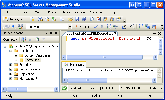 Um die Kompatibilitätsstufe der Datenbank zu aktualisieren, öffnen Sie ein Fenster "Neue Abfrage" in Management Studio, und geben Sie Folgendes ein: