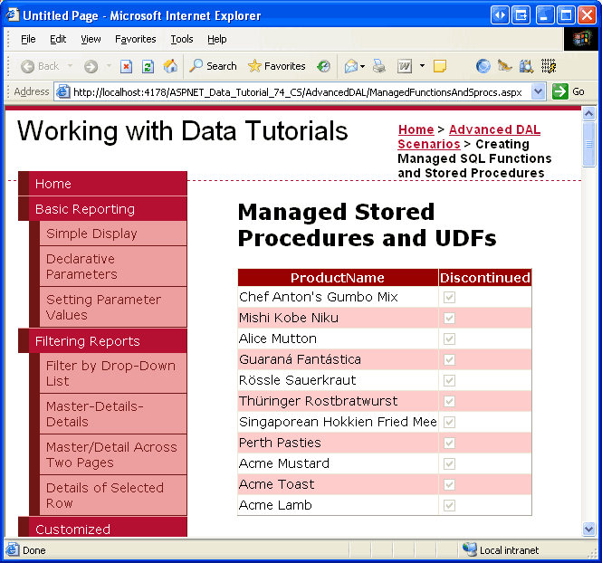 Abbildung 13: Die GetDiscontinuedProducts gespeicherte Prozedur gibt alle nicht mehr verfügbaren Produkte zurück (Klicken Sie hier, um das Bild in voller Größe anzuzeigen)