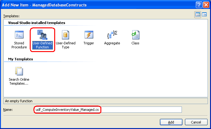 Die Vorlage "User-Defined Function" erstellt eine partial Klasse UserDefinedFunctions mit einer Methode, deren Name mit dem Namen der Klassendatei übereinstimmt (udf_ComputeInventoryValue_Managedin dieser Instanz). Diese Methode wird mit dem SqlFunction Attribut versehen, das die Methode als verwaltete UDF kennzeichnet.
