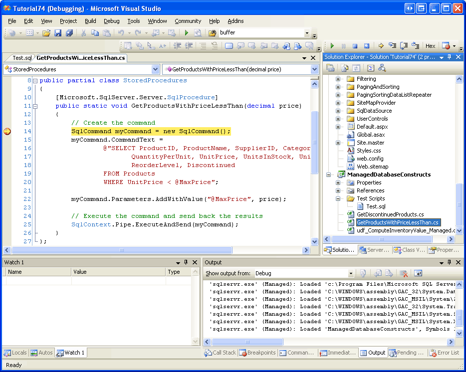 Anstatt die Klassendatei über die GetProductsWithPriceGreaterThan.cs Befehlszeile zu kompilieren, können Sie alternativ Visual C# Express Edition verwenden oder ein separates Klassenbibliotheksprojekt in Visual Studio Standard Edition erstellen. S ren Jacob Lauritsen hat freundlicherweise ein Visual C# Express Edition-Projekt zur Verfügung gestellt, das Code für die GetProductsWithPriceGreaterThan gespeicherte Prozedur sowie die beiden verwalteten gespeicherten Prozeduren und UDF, die in den Schritten 3, 5 und 10 erstellt wurden, enthält. Das S REN-Projekt enthält auch die T-SQL-Befehle, die zum Hinzufügen der entsprechenden Datenbankobjekte erforderlich sind.
