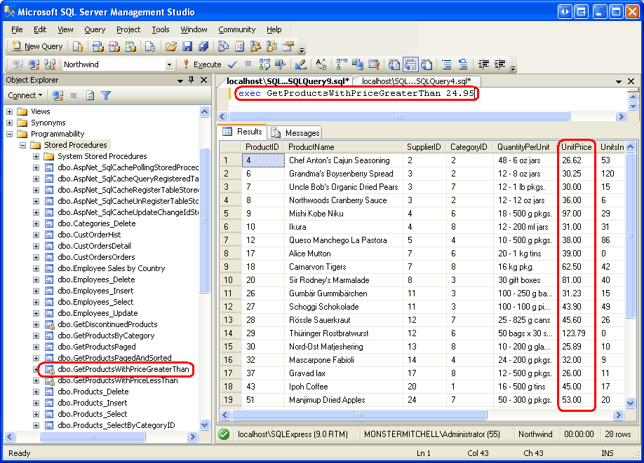 Während wir die Assembly der Northwind-Datenbank hinzugefügt haben, müssen wir noch eine gespeicherte Prozedur der GetProductsWithPriceGreaterThan Methode in der Assembly zuordnen. Öffnen Sie dazu ein neues Abfragefenster, und führen Sie das folgende Skript aus: