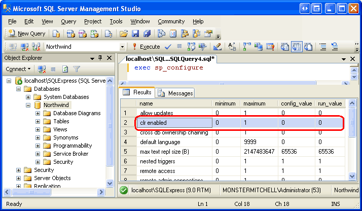 Um die Konfigurationsinformationen der Northwind-Datenbank zu untersuchen, geben Sie den Befehl exec sp_configure im Abfragefenster ein und führen ihn aus. Dies zeigt, dass die einstellung "clr enabled" derzeit auf 0 festgelegt ist.