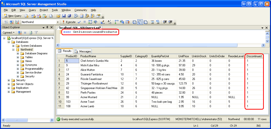 Abbildung 13: Die GetDiscontinuedProducts gespeicherte Prozedur gibt alle nicht mehr verfügbaren Produkte zurück (Klicken Sie hier, um das Bild in voller Größe anzuzeigen)