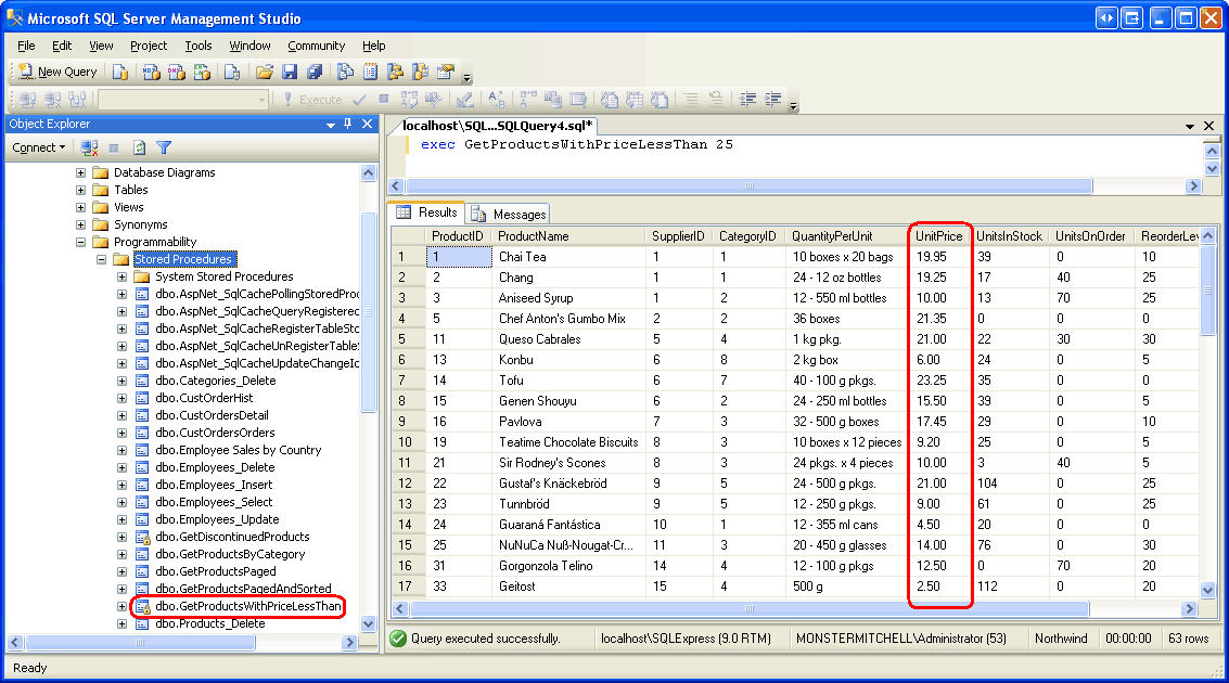 Dadurch wird eine neue gespeicherte Prozedur in der Northwind-Datenbank namens GetProductsWithPriceGreaterThan erstellt und der verwalteten Methode GetProductsWithPriceGreaterThan zugeordnet (die sich in der Klasse StoredProceduresbefindet, die sich in der Assembly ManuallyCreatedDBObjectsbefindet).