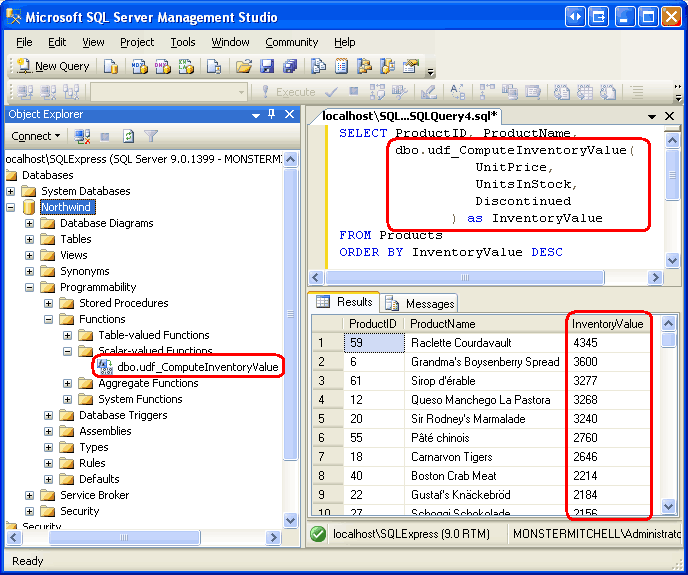 dbo.udf_ComputeInventoryValue– die in Schritt 9 erstellte T-SQL-UDF und -