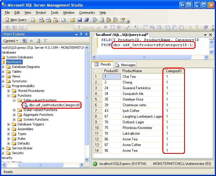 Datenbanken wie Microsoft SQL Server 2005 verwenden die Transact-strukturierte Abfragesprache (T-SQL) zum Einfügen, Ändern und Abrufen von Daten. Die meisten Datenbanksysteme enthalten Konstrukte zum Gruppieren einer Reihe von SQL-Anweisungen, die dann als einzelne wiederverwendbare Einheit ausgeführt werden können. Gespeicherte Prozeduren sind ein Beispiel. Ein weiteres ist user-Defined Functions(UDFs), ein Konstrukt, das wir in Schritt 9 genauer untersuchen.