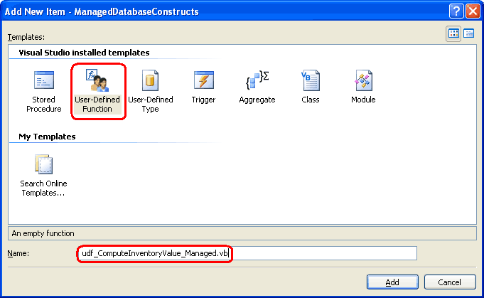 Um eine verwaltete UDF dem ManagedDatabaseConstructs Projekt hinzuzufügen, klicken Sie mit der rechten Maustaste auf den Projektnamen im Projektmappen-Explorer und wählen Sie "Neues Element hinzufügen" aus. Wählen Sie im Dialogfeld "Neues Element hinzufügen" die benutzerdefinierte Vorlage aus, und nennen Sie die neue UDF-Datei udf_ComputeInventoryValue_Managed.vb.