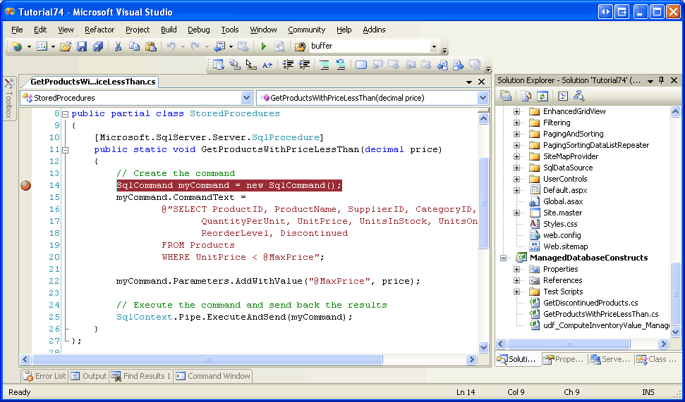 Stellen Sie sich vor, dass wir die GetProductsWithPriceLessThan verwaltete gespeicherte Prozedur debuggen wollten. Zunächst legen wir einen Haltepunkt im Code der GetProductsWithPriceLessThan Methode fest.
