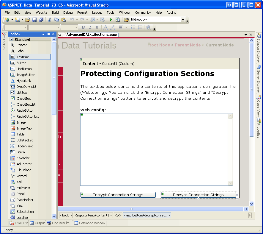 Um den programmgesteuerten Schutz von Konfigurationsinformationen zu veranschaulichen, erstellen wir eine ASP.NET Seite, die Schaltflächen zum Verschlüsseln und Entschlüsseln des <connectionStrings> Abschnitts Web.configenthält.