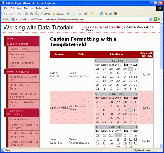 Das Anzeigen eines Datenfeldwerts als Text in einer GridView ist so einfach wie die Verwendung eines BoundFields. Bei bestimmten Szenarien werden die Daten jedoch am besten mithilfe eines bestimmten Websteuerelements ausgedrückt, anstatt nur Text zu verwenden. Eine solche Anpassung der Anzeige von Daten ist mit TemplateFields möglich. Anstatt beispielsweise das Einstellungsdatum des Mitarbeiters als Text anzuzeigen, könnten wir einen Kalender (mithilfe des Kalendersteuerelements) mit hervorgehobenem Einstellungsdatum anzeigen.