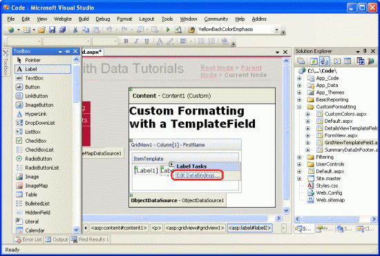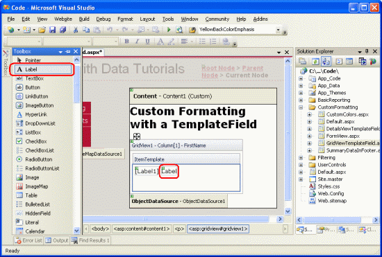 Um das LastName im FirstName TemplateField anzuzeigen, ziehen Sie das Label-Steuerelement aus der Toolbox in das FirstName TemplateField's ItemTemplate in der Vorlagenbearbeitungsschnittstelle von GridView.
