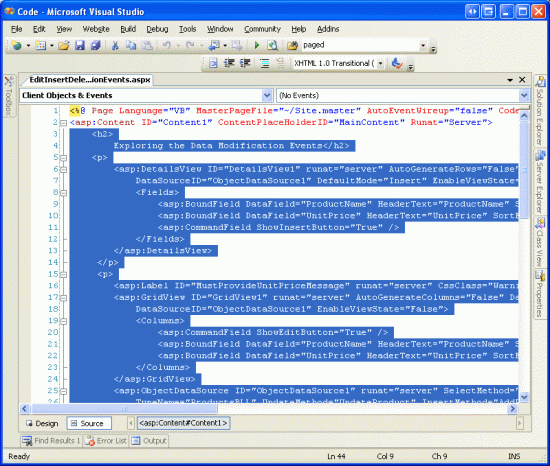 DataModificationEvents.aspxSeite in Visual Studio - Wechseln Sie zum deklarativen Markup der Seite (klicken Sie unten auf der Seite auf die Schaltfläche "Quelle").