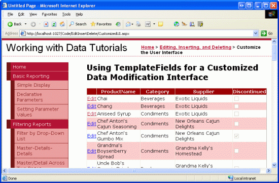 Die von den GridView- und DetailsView-Steuerelementen verwendeten BoundFields- und CheckBoxFields vereinfachen das Ändern von Daten aufgrund ihrer Fähigkeit zum Rendern von schreibgeschützten, bearbeitbaren und einfügbaren Schnittstellen. Diese Schnittstellen können gerendert werden, ohne dass zusätzliches deklaratives Markup oder Code hinzugefügt werden muss. Die Schnittstellen "BoundField" und "CheckBoxField" bieten jedoch oft nicht die Anpassungsfähigkeit, die in realen Szenarien benötigt wird. Um die bearbeitbare oder einfügbare Schnittstelle in einer GridView oder DetailsView anzupassen, müssen wir stattdessen ein TemplateField verwenden.
