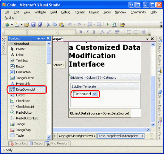 Da das BoundField als schreibgeschützt markiert wurde, enthalten sowohl das ItemTemplate als auch EditItemTemplate eine Bezeichnungs-Websteuerung, dessen Text-Eigenschaft an das anwendbare Datenfeld gebunden ist (CategoryName, in der obigen Syntax). Wir müssen das EditItemTemplate-Label-Websteuerelement durch ein DropDownList-Steuerelement ersetzen.