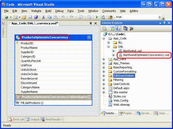 Anstatt die TableAdapters unserer vorhandenen DAL zu erweitern, um optimistische Parallelität zu verwenden (was eine Änderung der BLL erfordert), wollen wir stattdessen ein neues typisiertes DataSet namens NorthwindOptimisticConcurrency erstellen, dem wir einen Products TableAdapter hinzufügen, der optimistische Parallelität verwendet. Anschließend erstellen wir eine ProductsOptimisticConcurrencyBLL Business Logic Layer-Klasse, die über die entsprechenden Änderungen verfügt, um die optimistische Parallelität DAL zu unterstützen. Sobald diese Grundarbeiten erstellt wurden, können wir die ASP.NET Seite erstellen.
