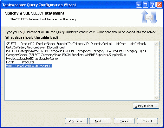 Auf dem nächsten Bildschirm werden wir aufgefordert, die sql-Abfrage zu verwenden, wobei die Standardabfrage von TableAdapter bereits geladen ist. Erweitern Sie die vorhandene Abfrage, um die Klausel WHERE ProductID = @ProductIDeinzuschließen, wie in Abbildung 10 dargestellt.