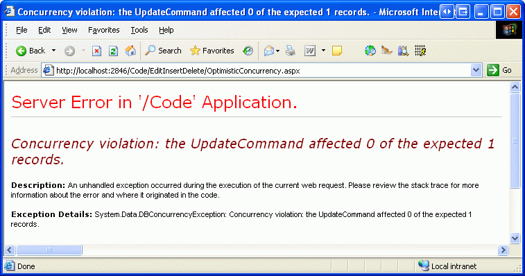 Abbildung 17: Wenn eine Parallelitätsverletzung erkannt wird, wird ein DBConcurrencyException-Fehler ausgelöst (Klicken Sie, um das Bild in voller Größe anzuzeigen).