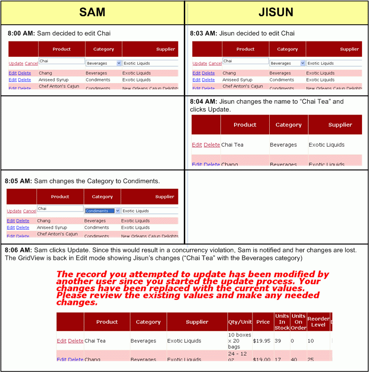 Stellen Sie sich beispielsweise vor, dass zwei Benutzer, Jisun und Sam, beide eine Seite in unserer Anwendung besucht haben, mit der Besucher die Produkte über ein GridView-Steuerelement aktualisieren und löschen konnten. Beide klicken auf die Schaltfläche "Bearbeiten" in der GridView um die gleiche Zeit. Jisun ändert den Produktnamen in "Chai Tea" und klickt auf die Schaltfläche "Aktualisieren". Das Nettoergebnis ist eine UPDATE Anweisung, die an die Datenbank gesendet wird, die alle aktualisierbaren Felder des Produkts festlegt (obwohl Jisun nur ein Feld aktualisiert hat). ProductName Zu diesem Zeitpunkt hat die Datenbank die Werte "Chai Tea", die Kategorie "Getränke", den Lieferanten Exotische Flüssigkeiten usw. für dieses bestimmte Produkt. Auf dem Bildschirm von Sam wird jedoch weiterhin der Produktname in der bearbeitbaren GridView-Zeile als "Chai" angezeigt. Ein paar Sekunden nach dem Commit von Jisuns Änderungen aktualisiert Sam die Kategorie auf "Condiments" und klickt auf "Aktualisieren". Dies führt zu einer UPDATE Anweisung, die an die Datenbank gesendet wird, die den Produktnamen auf "Chai", die CategoryID entsprechende Kategorie-ID für Getränke usw. festlegt. Jisuns Änderungen an dem Produktnamen wurden überschrieben. In Abbildung 1 wird diese Ereignisreihe grafisch dargestellt.