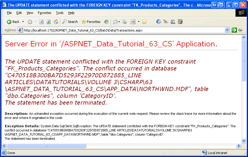 Um dieses Verhalten zu veranschaulichen, besuchen Sie diese Seite über einen Browser. Zunächst sollte die erste Seite mit Daten angezeigt werden, wie in Abbildung 8 dargestellt. Klicken Sie als Nächstes auf die Schaltfläche "Kategorien ändern" (WITH TRANSACTION). Dies führt zu einem Postback, bei dem versucht wird, alle CategoryID-Werte der Produkte zu aktualisieren, was jedoch zu einer Fremdschlüsselverletzung führt (siehe Abbildung 9).