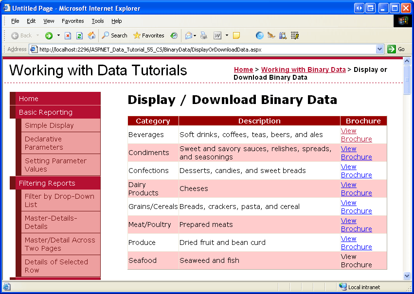 Zeigen Sie diese Seite über einen Browser an (siehe Abbildung 5). Jede der acht Kategorien wird aufgelistet. Die sieben Kategorien mit BrochurePath-Werten zeigen den BrochurePath-Wert im entsprechenden BoundField an. Meeresfrüchte, die einen NULL Wert für ihren BrochurePath haben, zeigen eine leere Zelle an.
