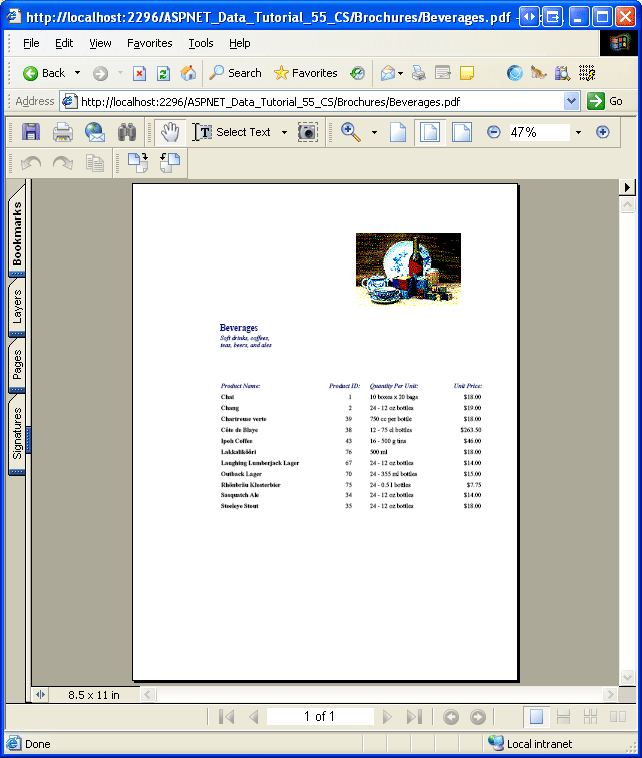 Nachdem diese Seite erstellt wurde, kann ein bestimmtes Kategoriebild durch den Besuch von DisplayCategoryPicture.aspx?CategoryID=categoryID angezeigt werden. Abbildung 11 zeigt das Bild der Kategorie Getränke, das von DisplayCategoryPicture.aspx?CategoryID=1 aus angesehen werden kann.