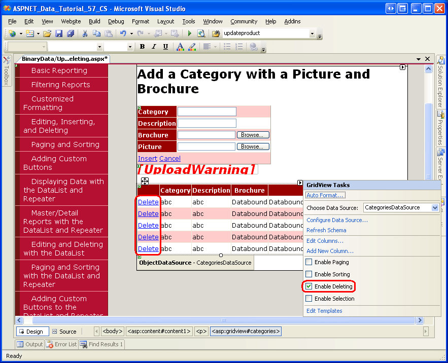 Im vorherigen Lernprogramm haben wir eine Seite mit dem Namen UploadInDetailsView.aspx erstellt, die alle Kategorien in einer GridView aufgelistet und eine DetailsView bereitgestellt hat, um dem System neue Kategorien hinzuzufügen. In diesem Lernprogramm erweitern wir die GridView so, dass die Bearbeitungs- und Löschunterstützung eingeschlossen wird. Anstatt weiter zu arbeiten, UploadInDetailsView.aspx wollen wir stattdessen die Änderungen dieses Tutorials auf der UpdatingAndDeleting.aspx Seite aus demselben Ordner platzieren. ~/BinaryData Kopieren Sie das deklarative Markup und den Code von UploadInDetailsView.aspx bis UpdatingAndDeleting.aspx.