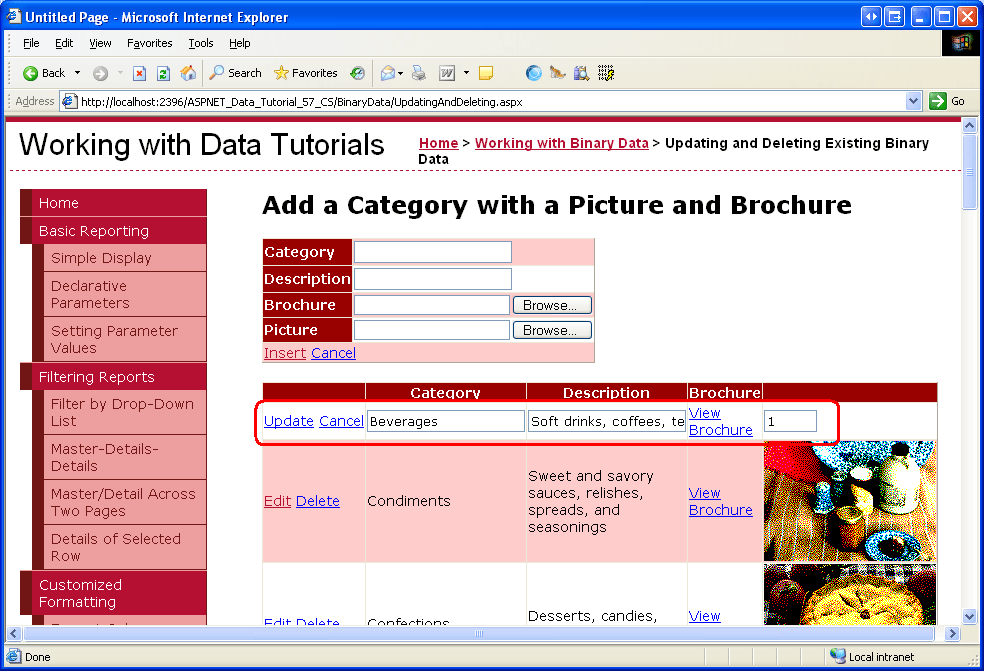 Mit diesem Code können Sie eine Kategorie bearbeiten und die aktuelle Broschüre verwenden, keine Broschüre verwenden oder eine neue hochladen. Fahren Sie fort, und probieren Sie es aus. Legen Sie Haltepunkte in den RowUpdating Und RowUpdated Ereignishandlern fest, um einen Eindruck vom Workflow zu erhalten.