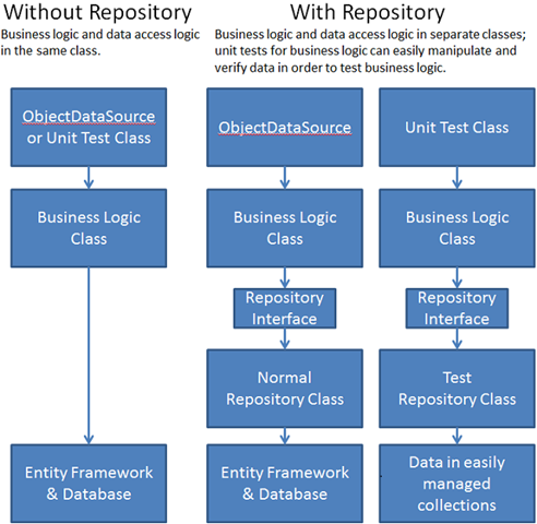 In einigen ObjectDataSource Dokumentationen, z. B. der ObjectDataSource-Klassenübersicht, ruft das Steuerelement eine Klasse auf, die als Geschäftsobjekt bezeichnet wird, das sowohl Geschäftslogik als auch Datenzugriffslogik enthält. In diesem Lernprogramm erstellen Sie separate Klassen für Geschäftslogik und datenzugriffslogik. Die Klasse, die datenzugriffslogik kapselt, wird als Repository bezeichnet. Die Geschäftslogikklasse enthält sowohl Geschäftslogikmethoden als auch Datenzugriffsmethoden, aber die Datenzugriffsmethoden rufen das Repository auf, um Datenzugriffsaufgaben auszuführen.