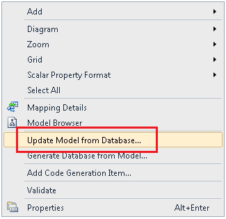 Öffnen Sie im DAL-Ordner die Datei "SchoolModel.edmx ", klicken Sie mit der rechten Maustaste auf die Entwurfsoberfläche, und wählen Sie "Modell aus Datenbank aktualisieren" aus.