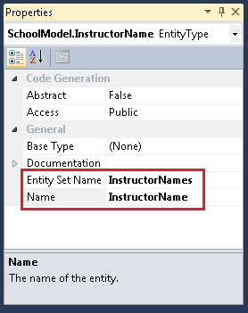 Klicken Sie unter SchoolModel (nicht SchoolModel.Store) mit der rechten Maustaste auf "vInstructorName ", und wählen Sie "Eigenschaften" aus. Ändern Sie im Eigenschaftenfenster die Name-Eigenschaft in "InstructorName", und ändern Sie die Eigenschaft "Entity Set Name " in "InstructorNames".