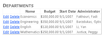 Nachdem Sie die Änderung gespeichert haben, können Sie keine Zeile aus der Person Tabelle löschen, wenn diese Person ein Abteilungsadministrator ist. In einer Produktionsanwendung würden Sie eine bestimmte Fehlermeldung angeben, wenn eine Datenbankeinschränkung einen Löschvorgang verhindert, oder Sie würden einen kaskadierenden Löschvorgang angeben. Ein Beispiel zum Angeben eines kaskadierenden Löschvorgangs finden Sie unter Entity Framework und ASP.NET – Erste Schritte Teil 2.